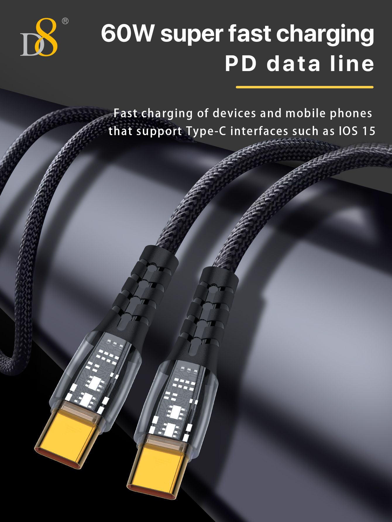 60W Fast Charging USB-C to USB-C Cable (Thickened Copper Core, Intelligent Chip, Gold-Plated Connector, Braided, Compatible with iPhone 15, Black)