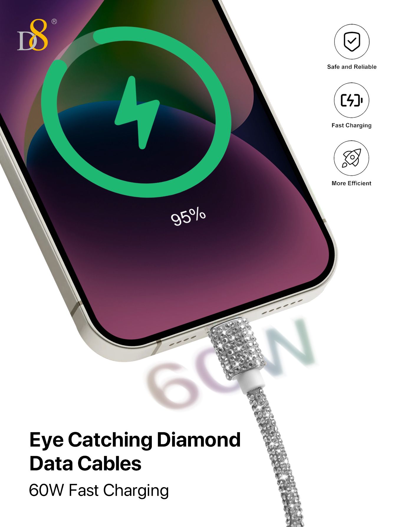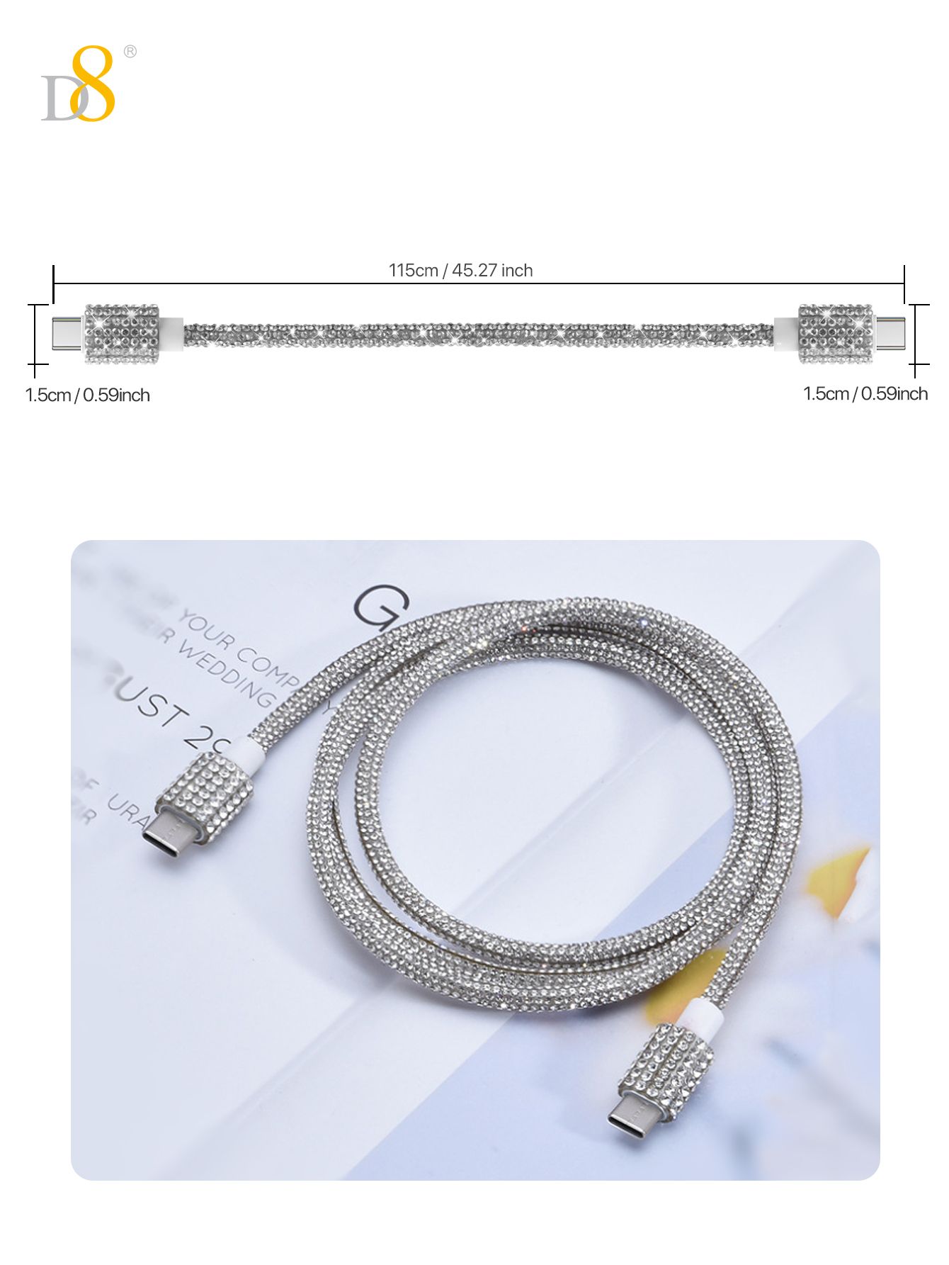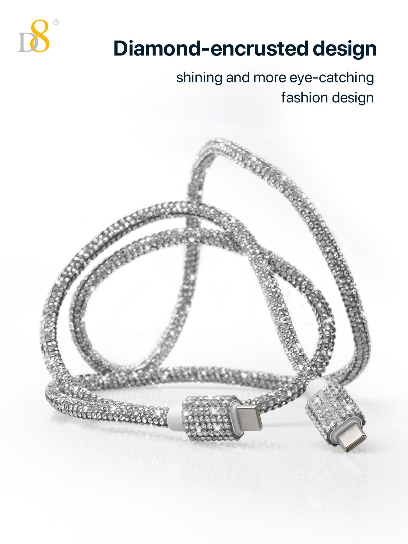60W Fast Charging USB-C to USB-C Cable (Diamond-Encrusted Design, Shining Appearance, Compatible with iPhone 15, Silver)