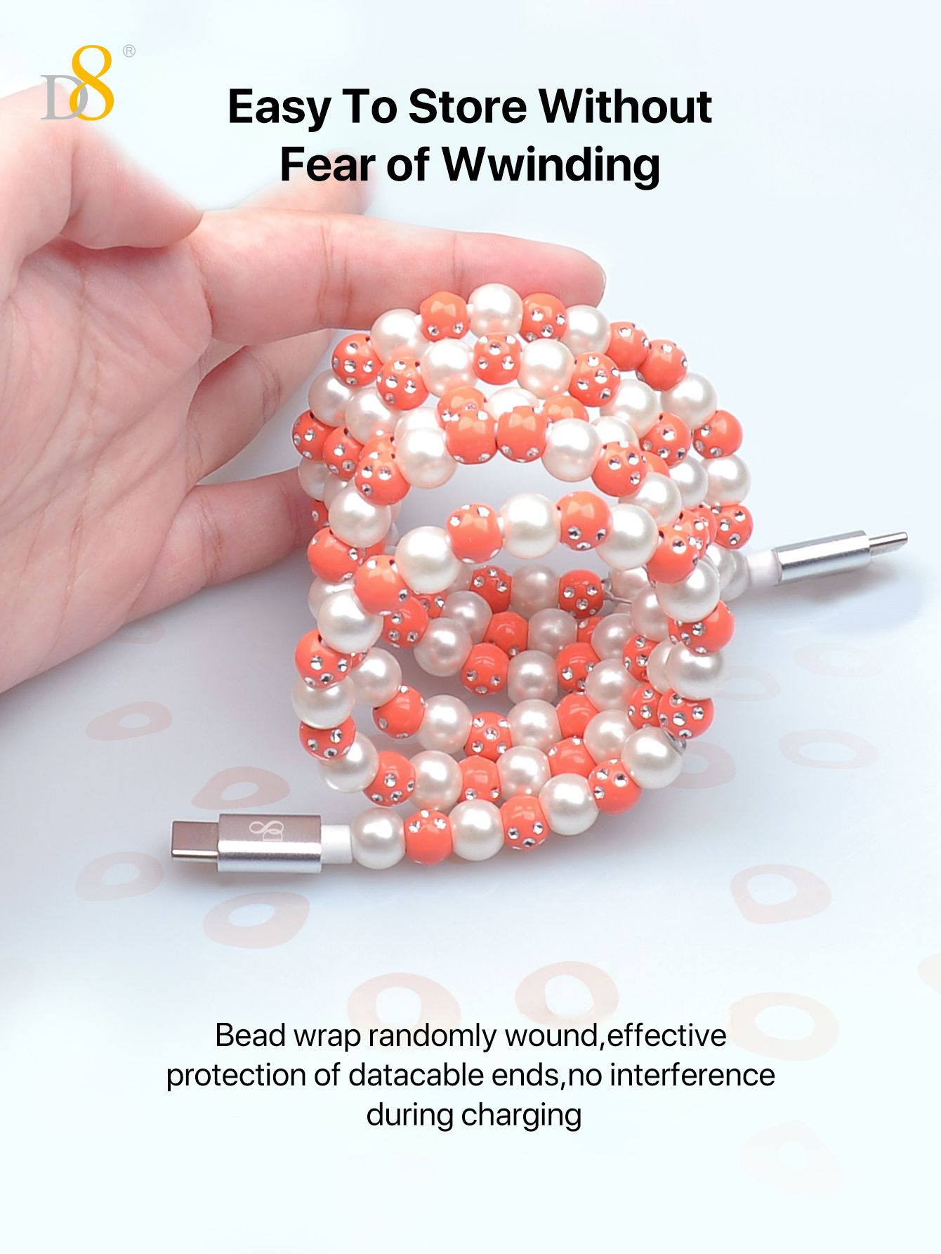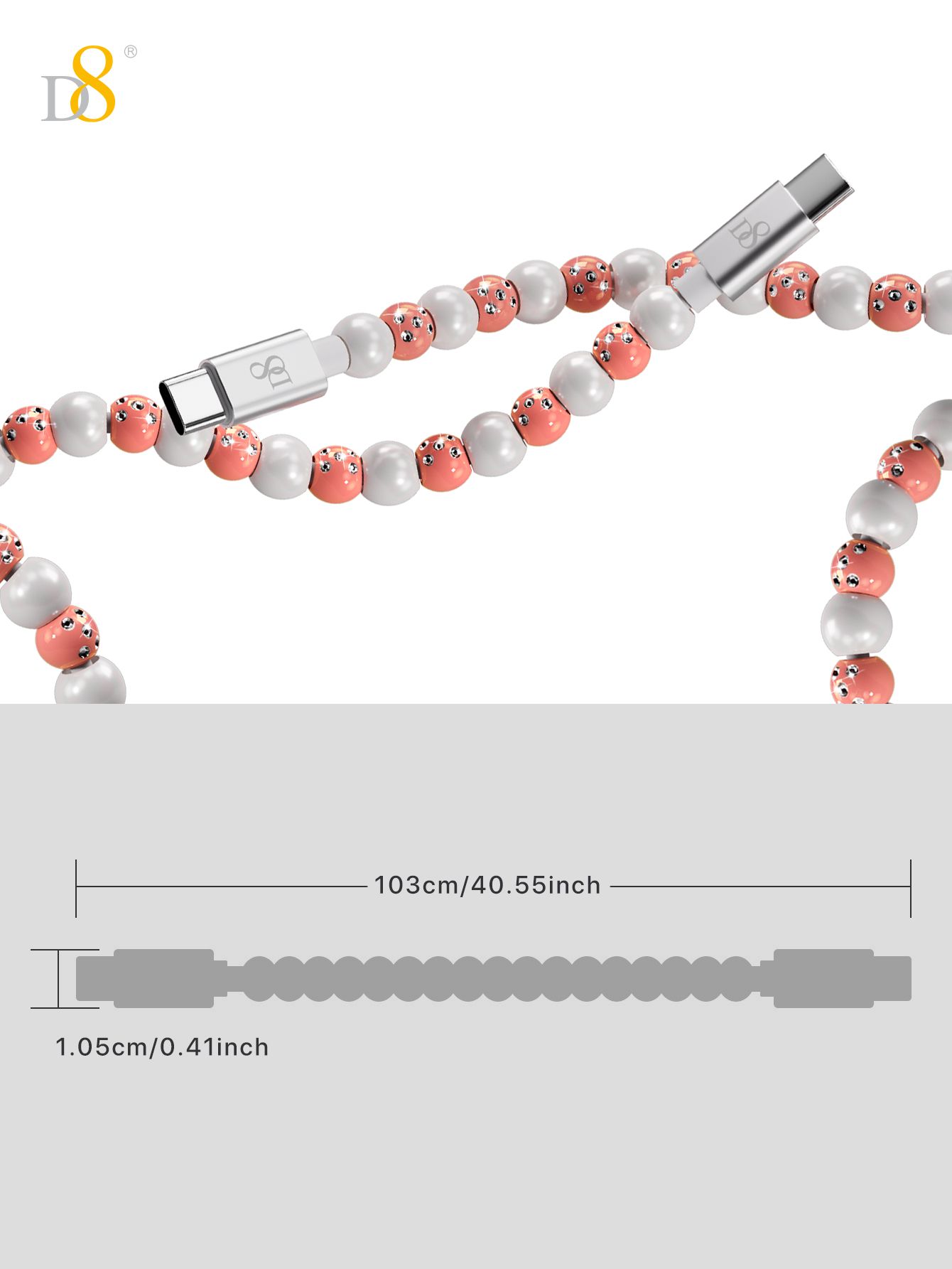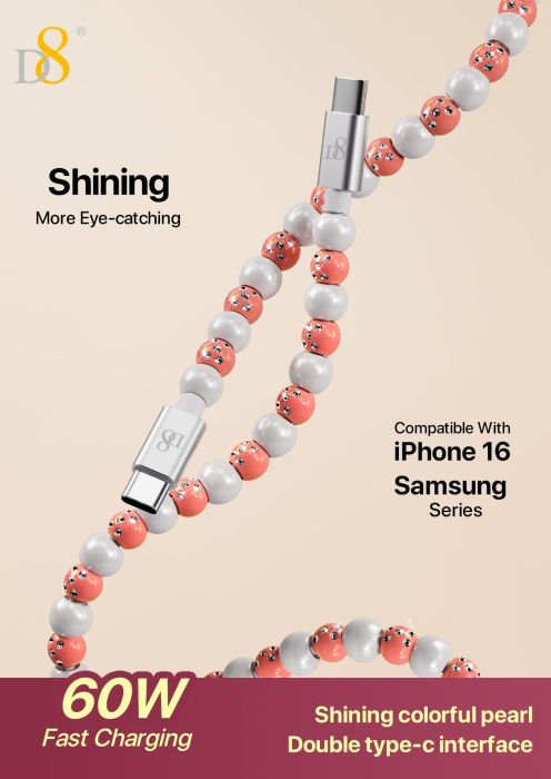 60W Fast Charging USB-C to USB-C Cable (Shining Colorful Pearl Beaded Design, Jewelry Style, Compatible with iPhone 16 & Samsung, Pink-Gray)