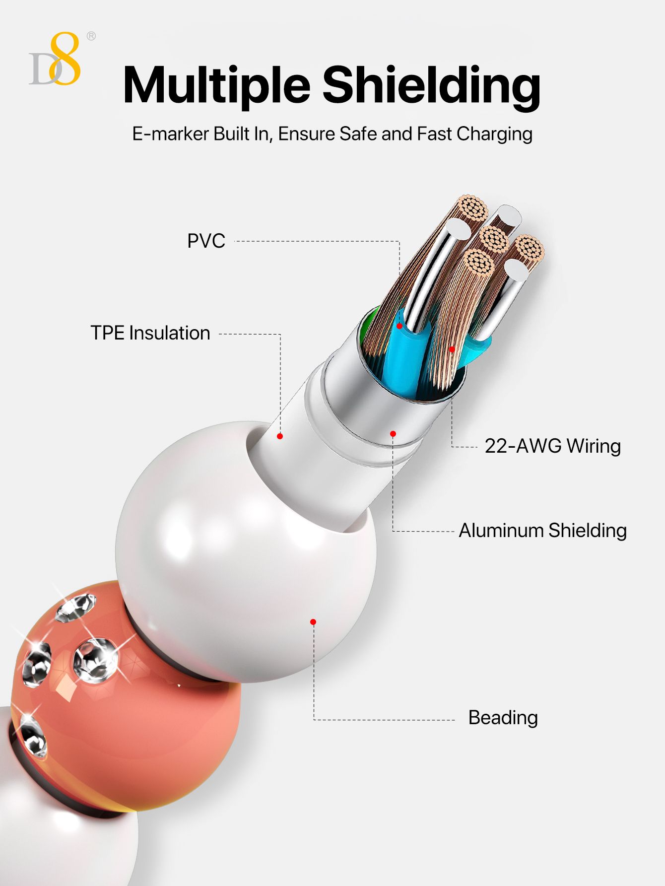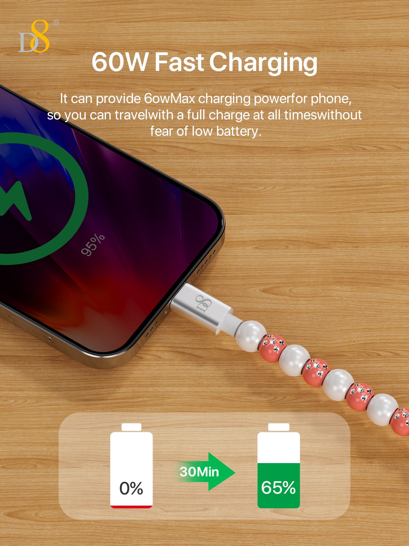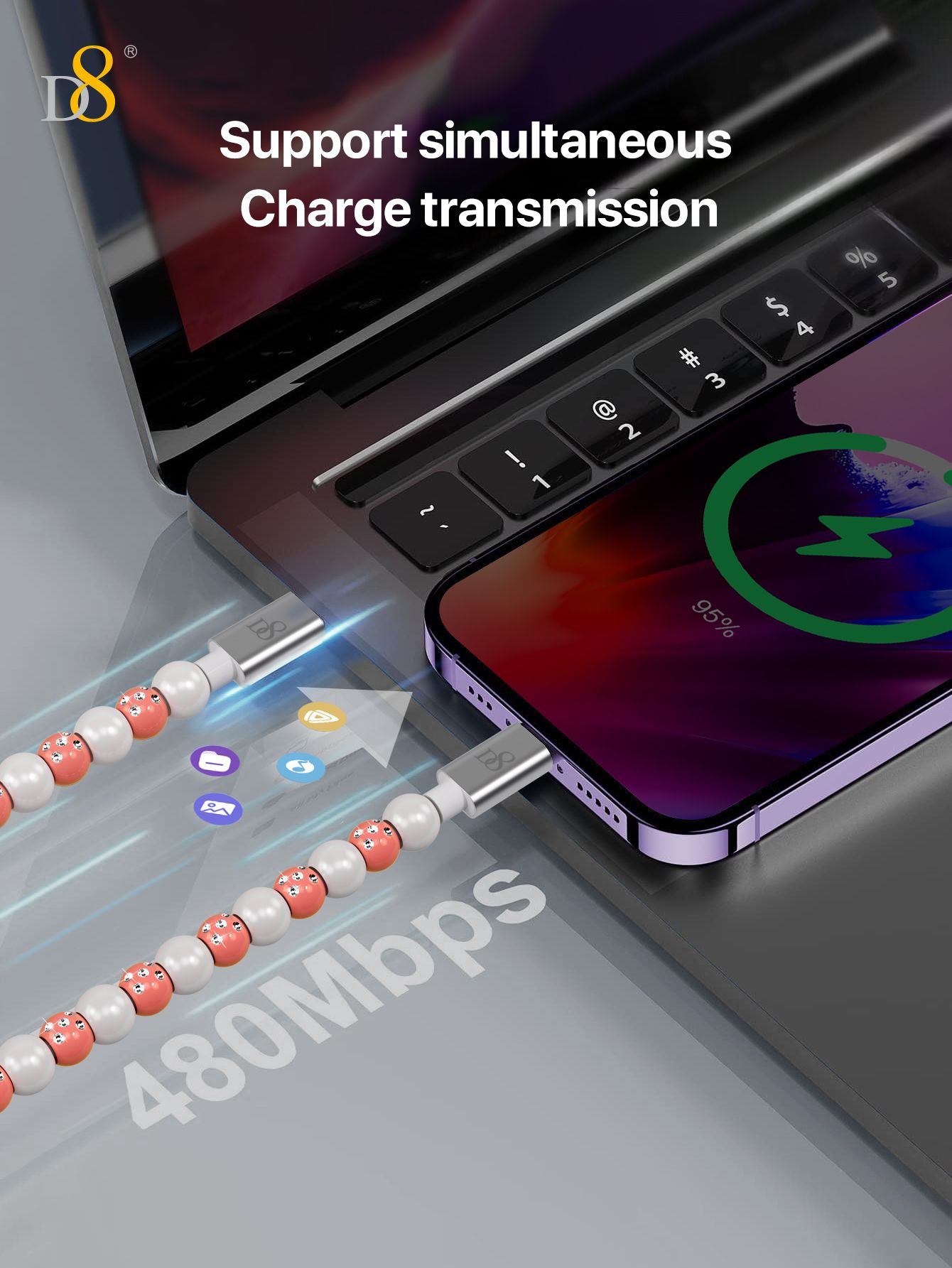 60W Fast Charging USB-C to USB-C Cable (Shining Colorful Pearl Beaded Design, Jewelry Style, Compatible with iPhone 16 & Samsung, Pink-Gray)