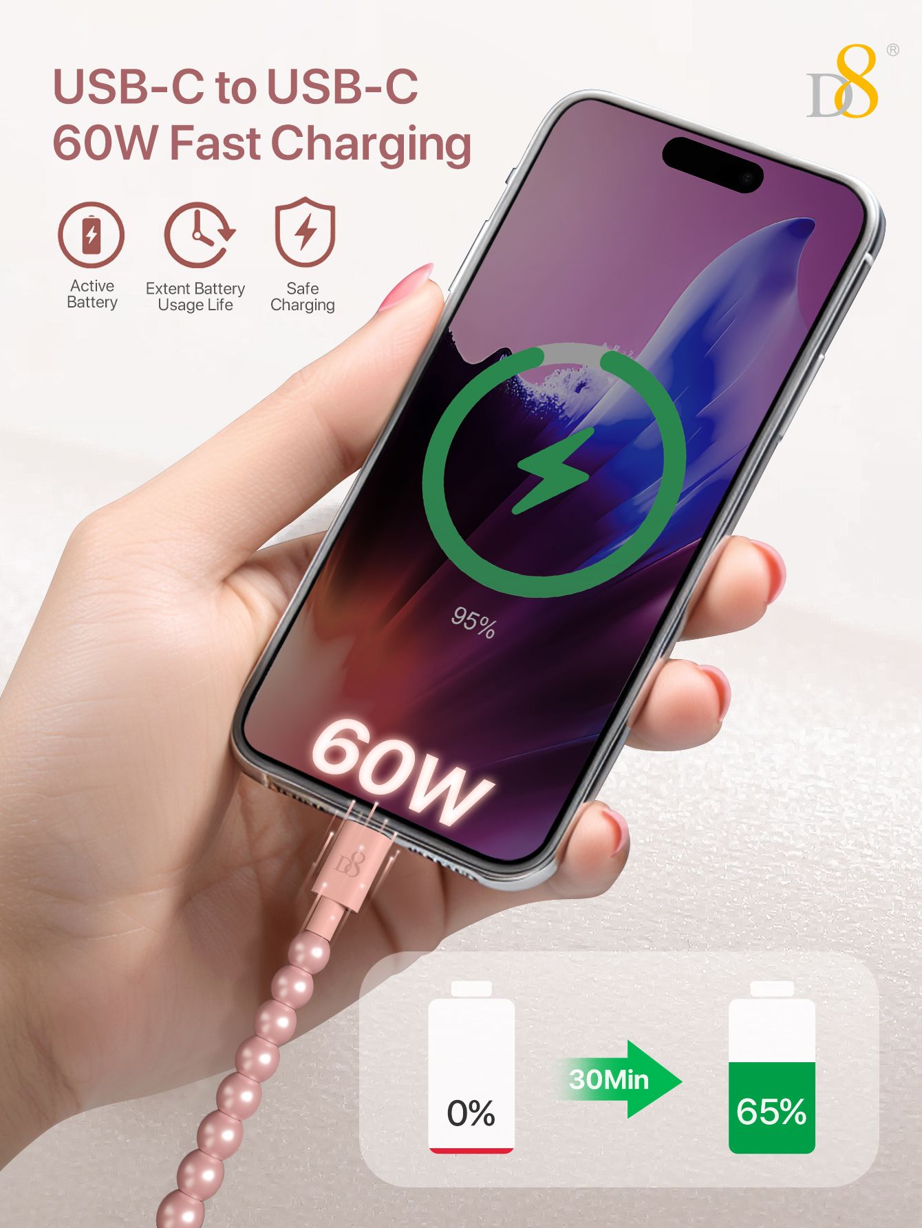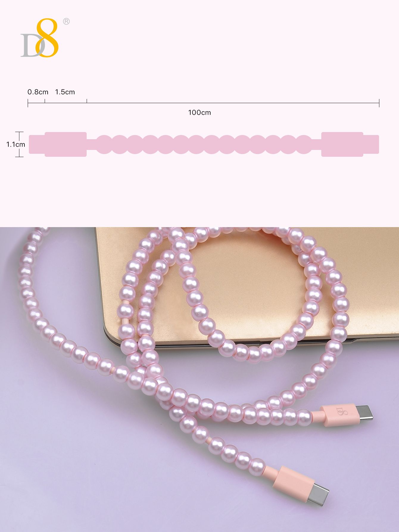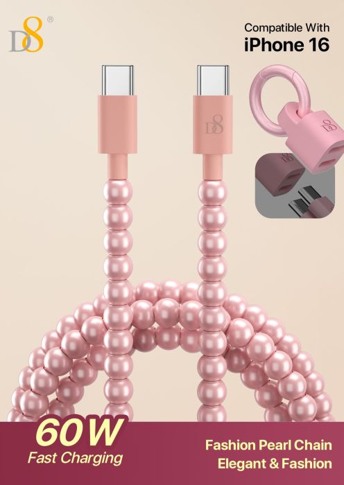 60W Fast Charging USB-C to USB-C Cable (Fashion Pearl Chain Design, Portable Storage Ring, Compatible with iPhone 16, Pink)