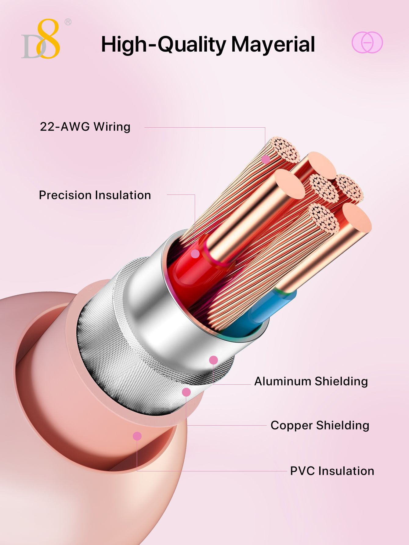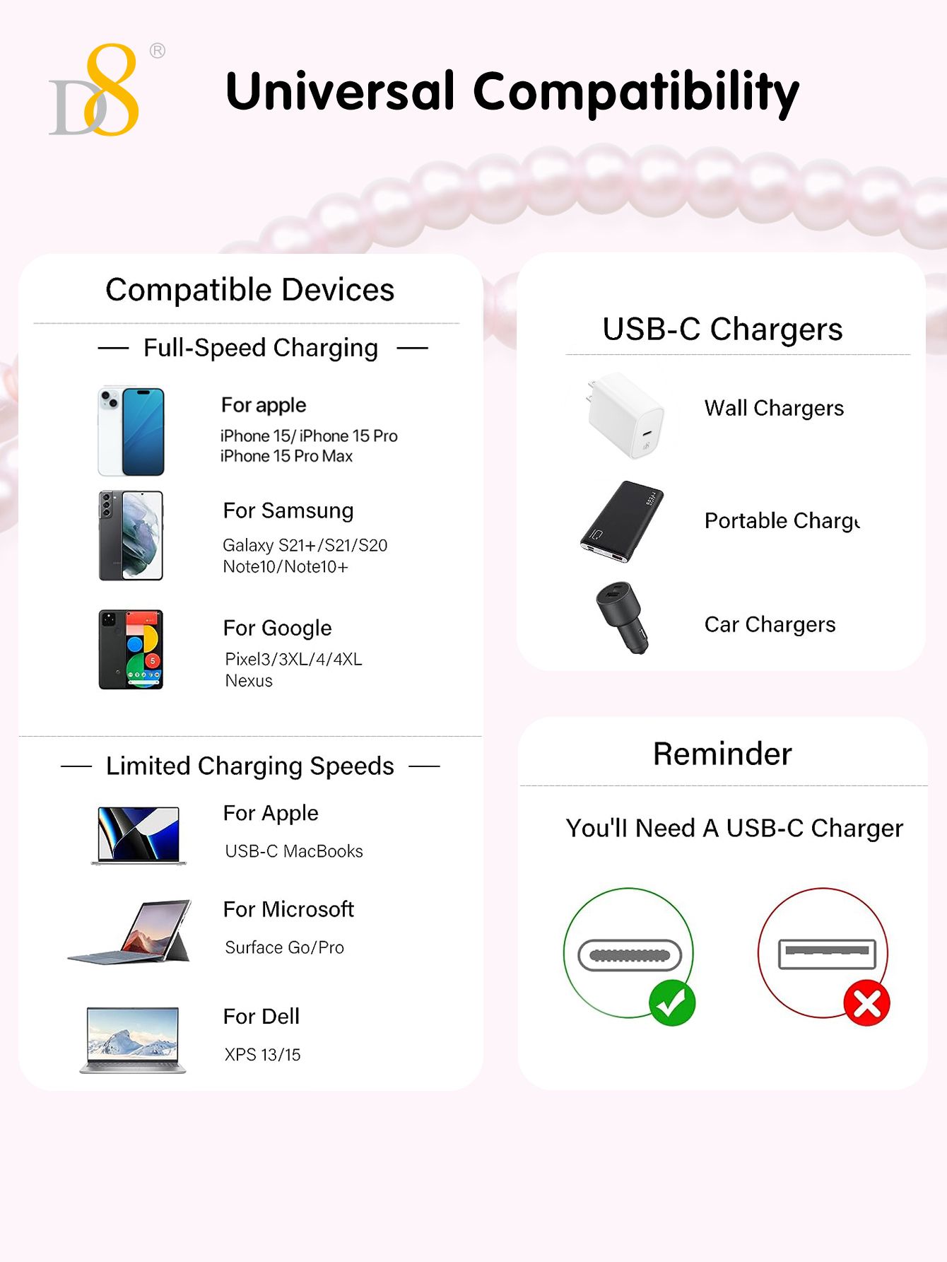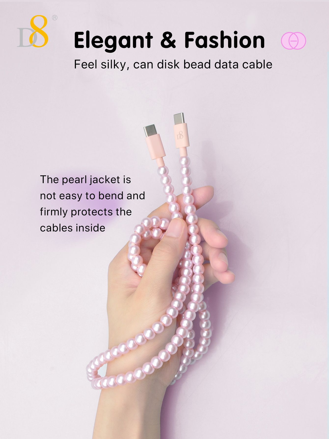 60W Fast Charging USB-C to USB-C Cable (Fashion Pearl Chain Design, Portable Storage Ring, Compatible with iPhone 16, Pink)