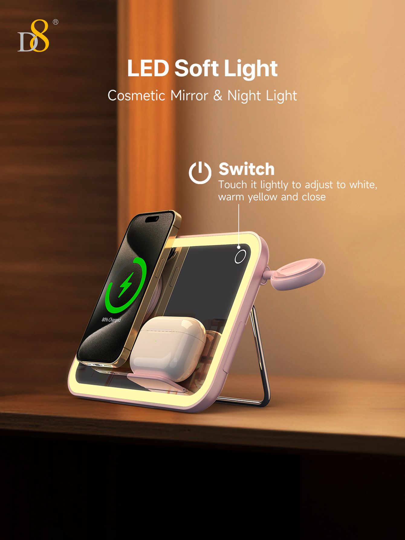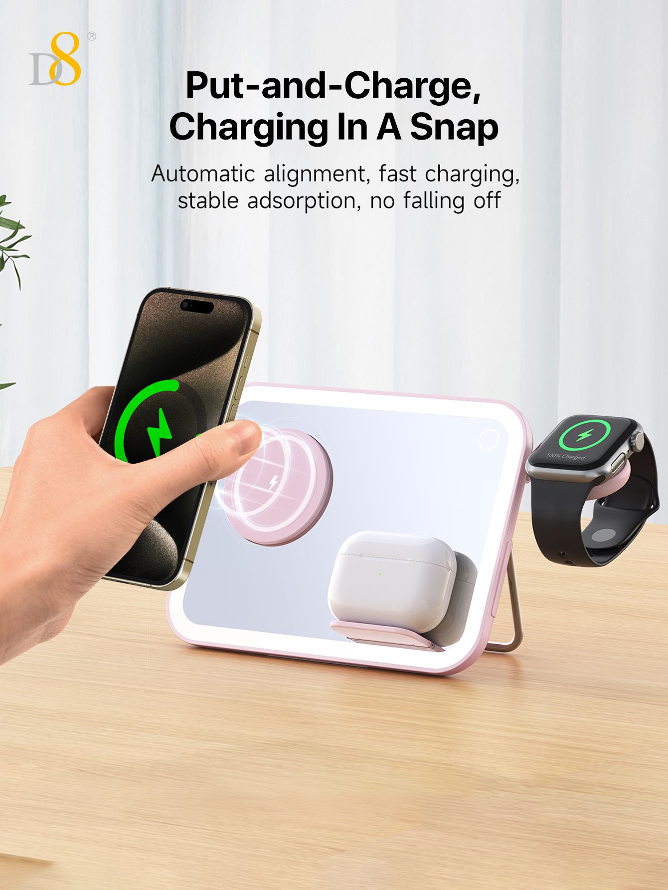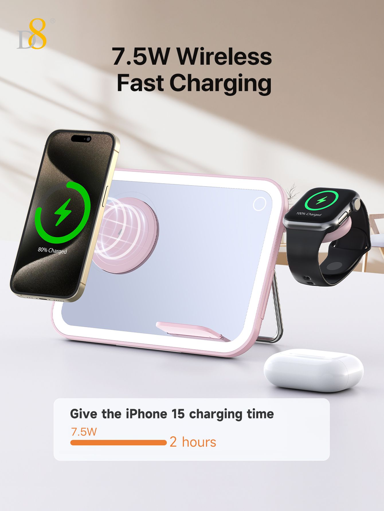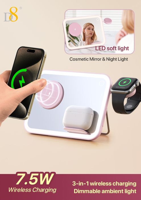 7.5W 3-in-1 Wireless Charging Makeup Mirror (Dimmable Ambient Light, Compatible with iPhone, iWatch & AirPods, Pink)