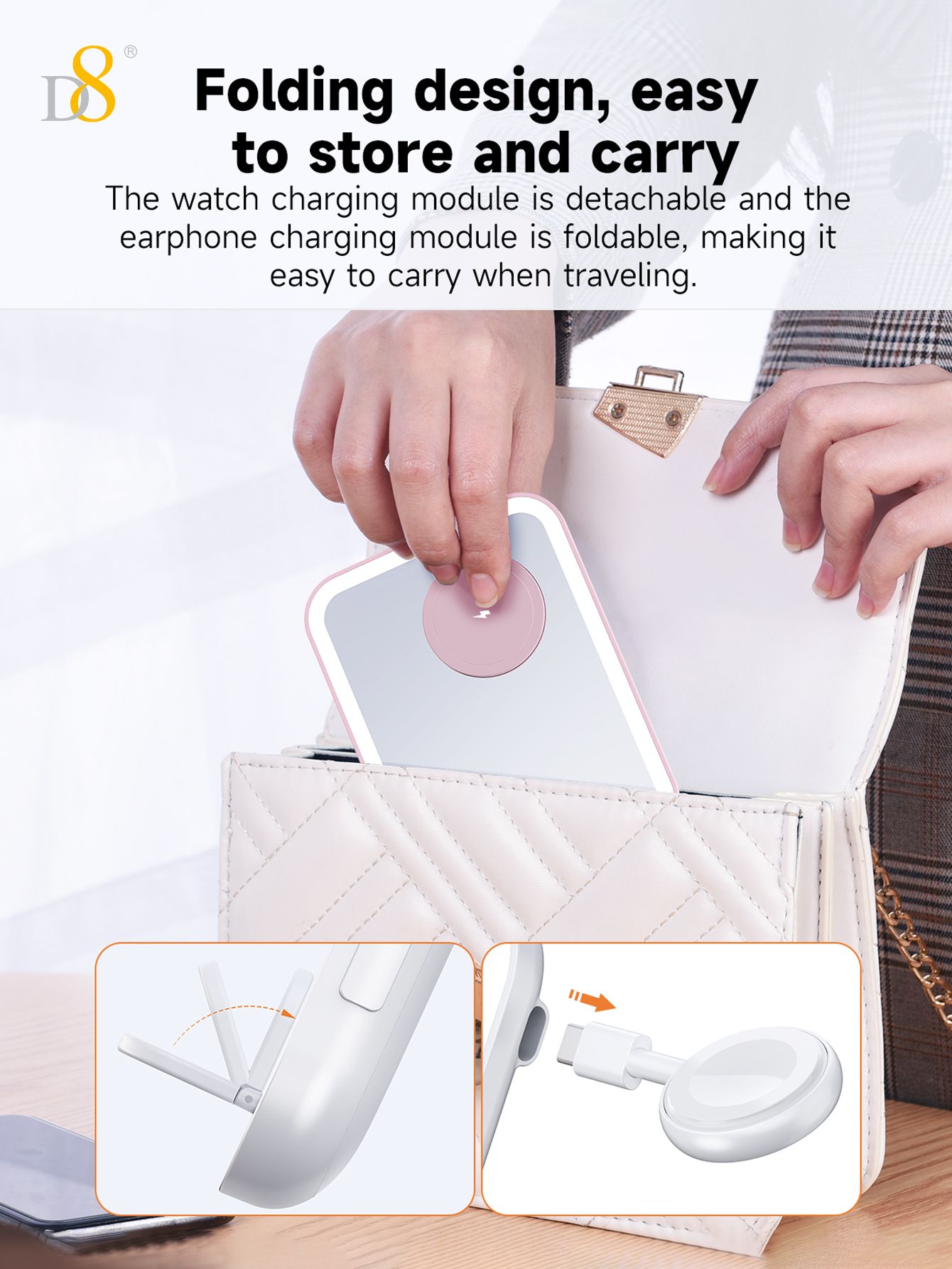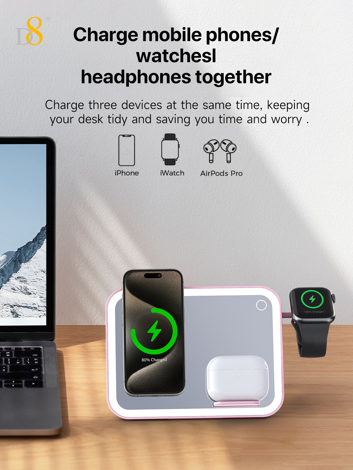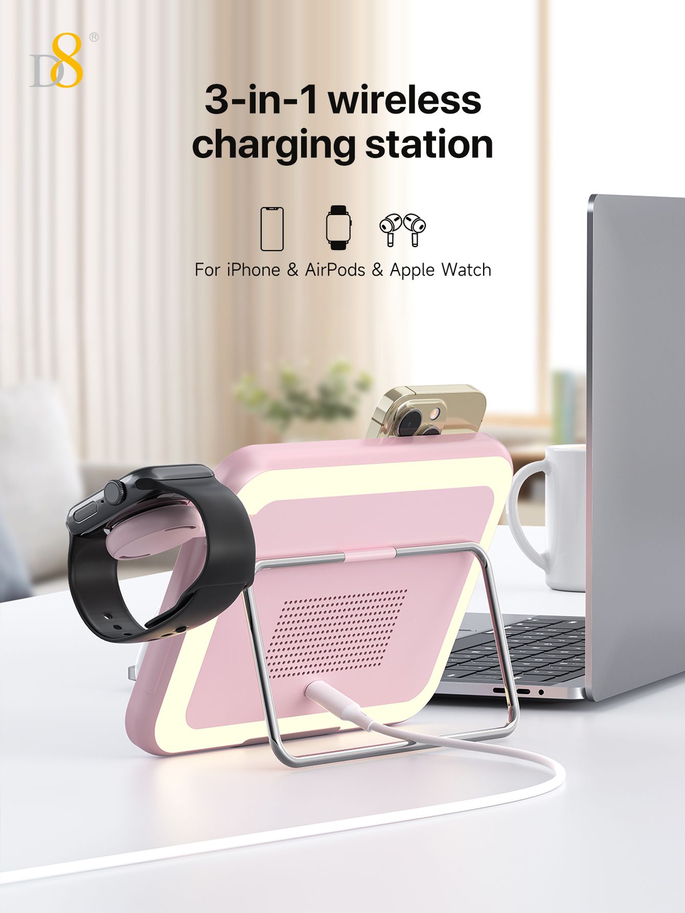 7.5W 3-in-1 Wireless Charging Makeup Mirror (Dimmable Ambient Light, Compatible with iPhone, iWatch & AirPods, Pink)