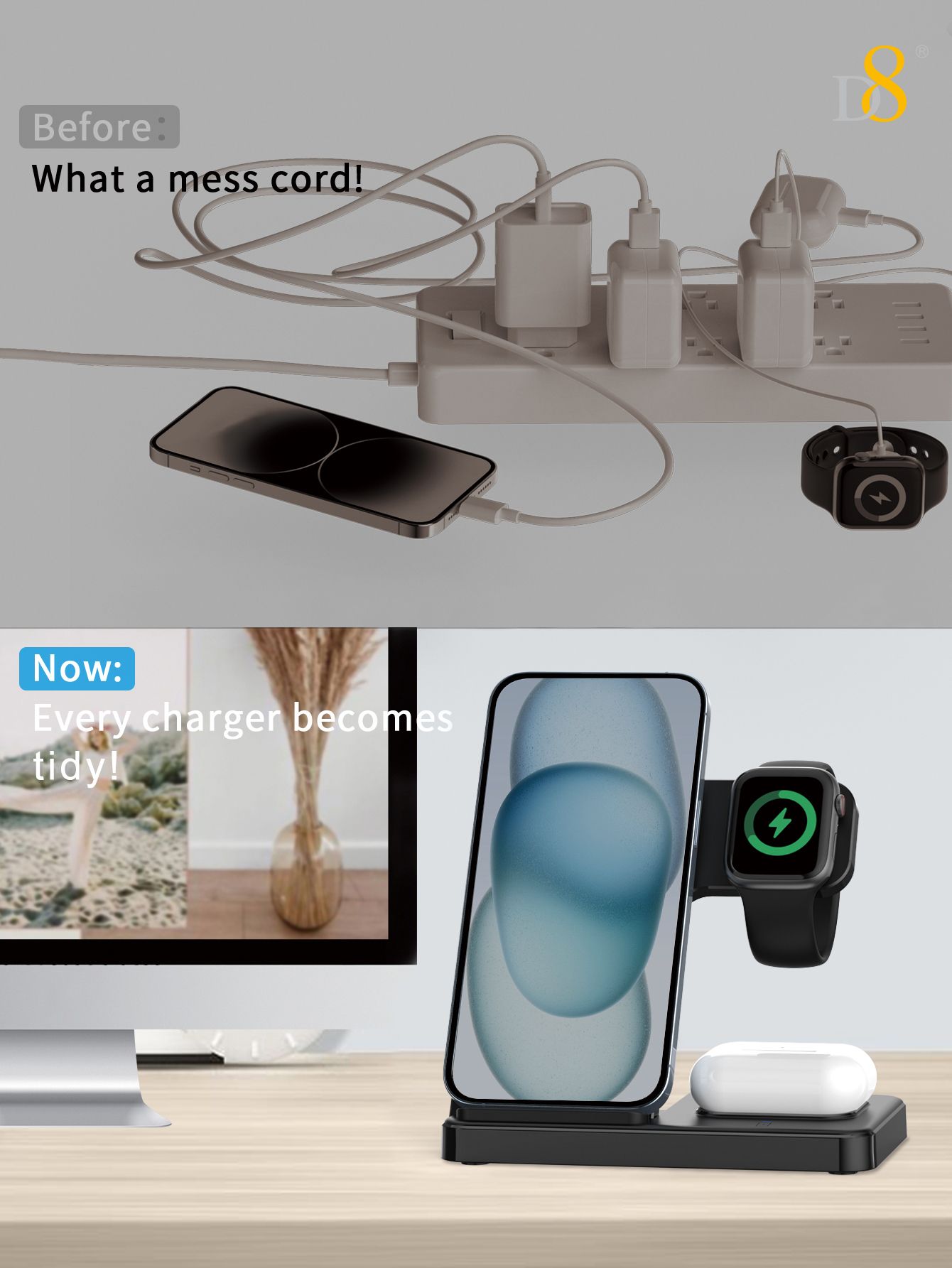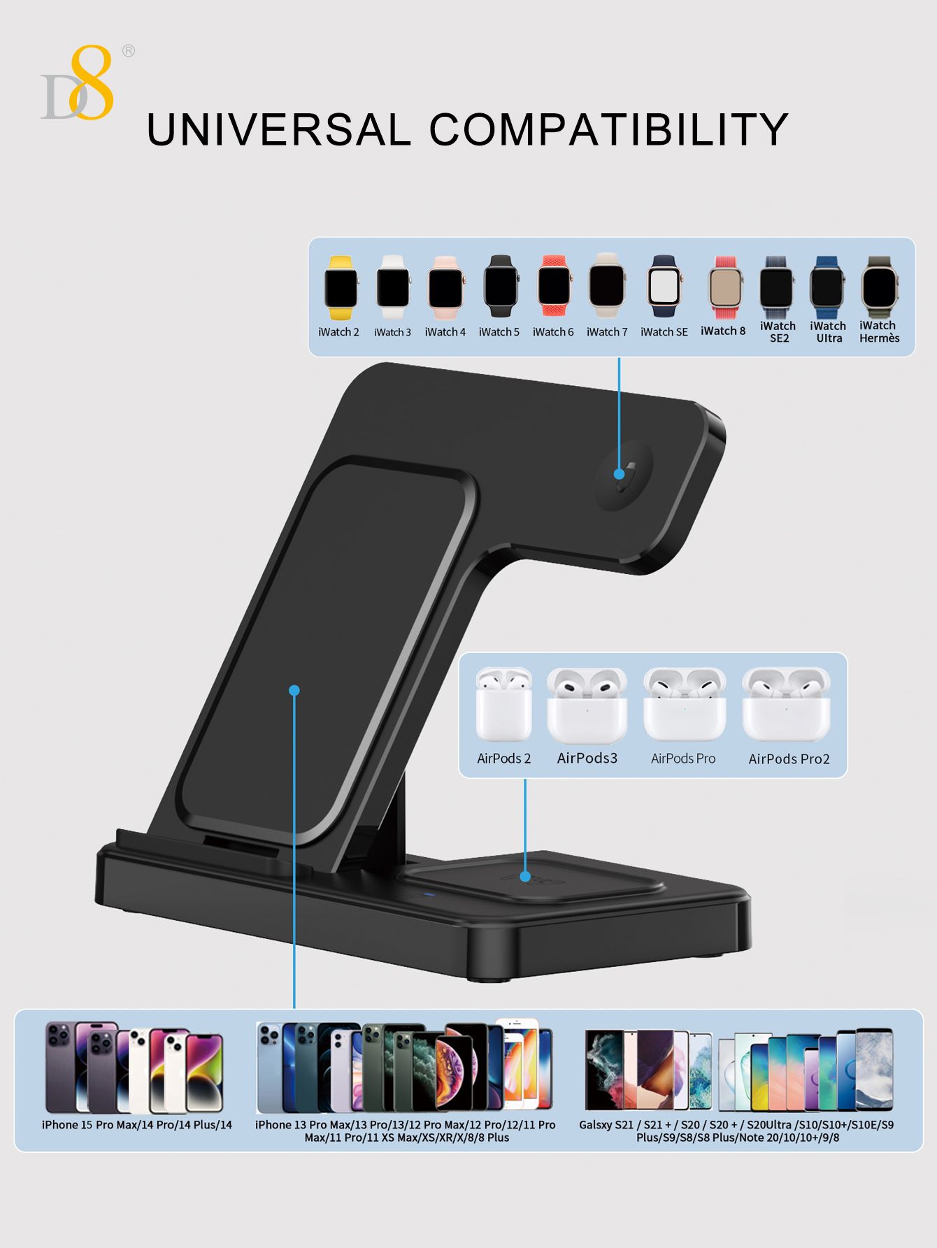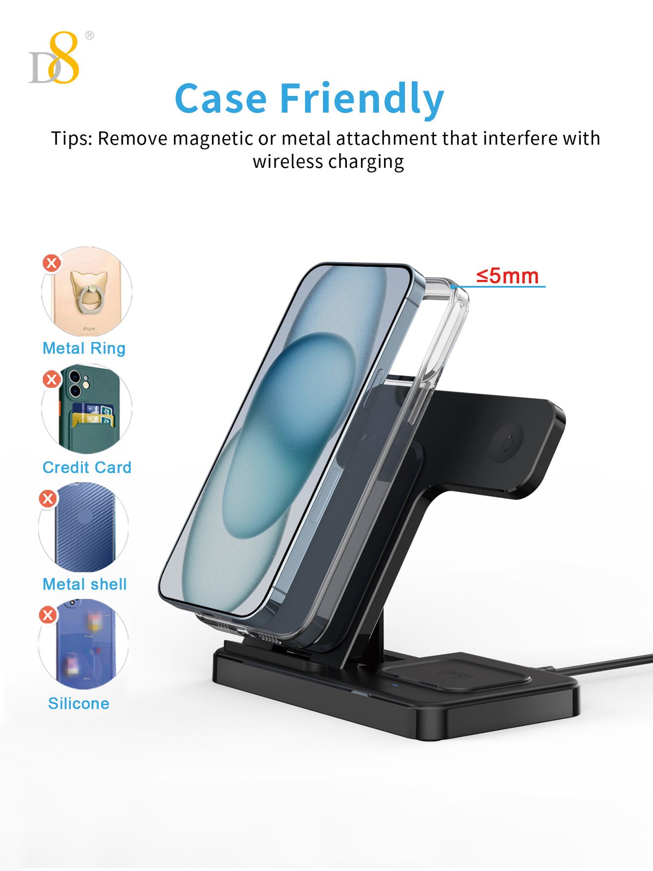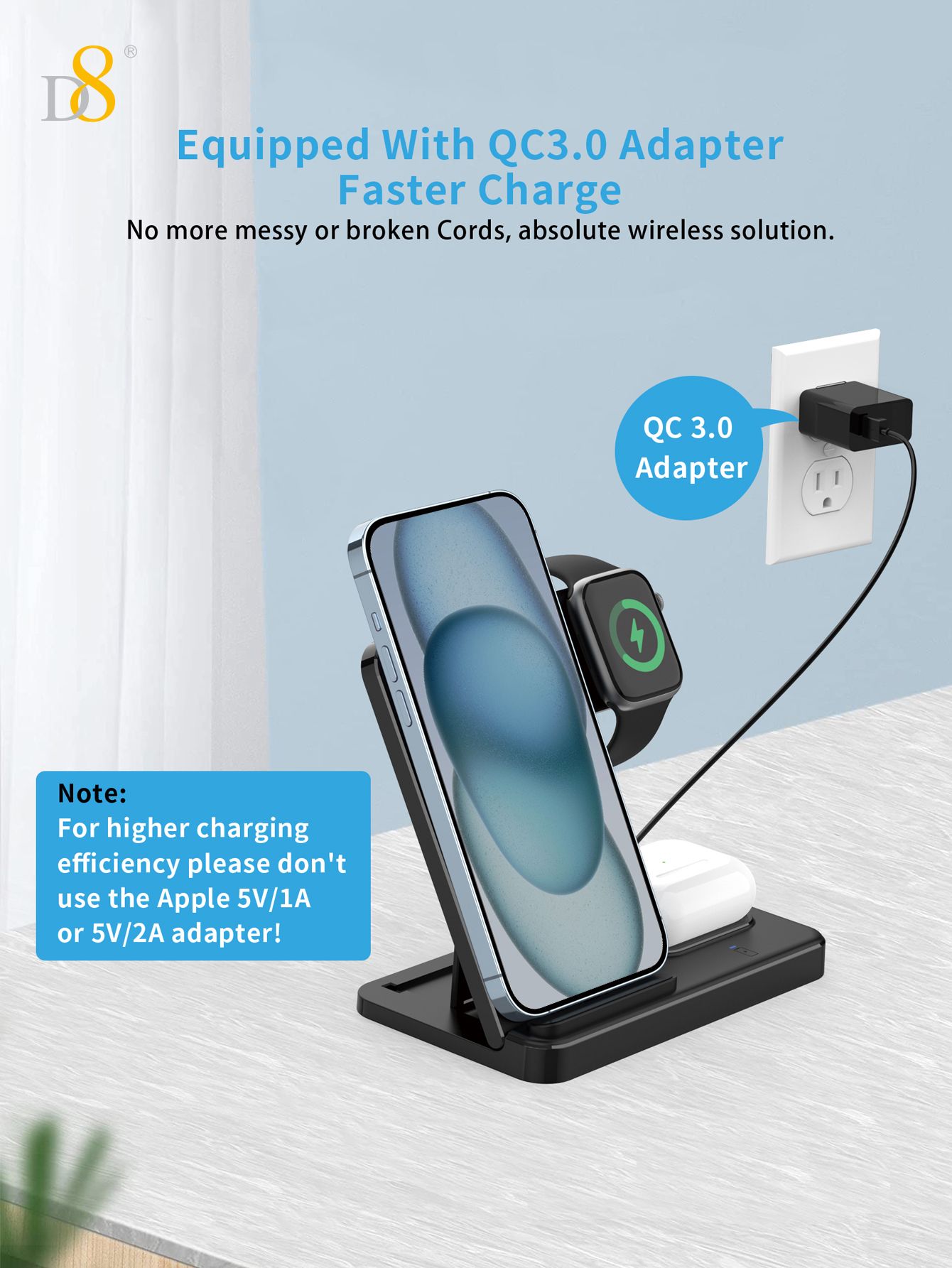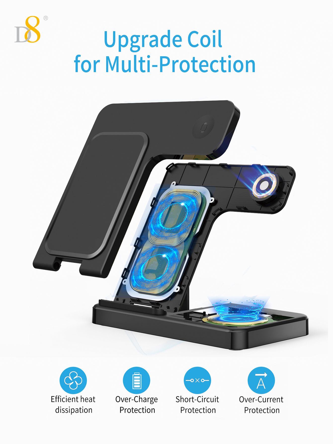 15W 3-in-1 Wireless Charger Stand (Independent Coils, Compatible with iPhone 12-16, Black)