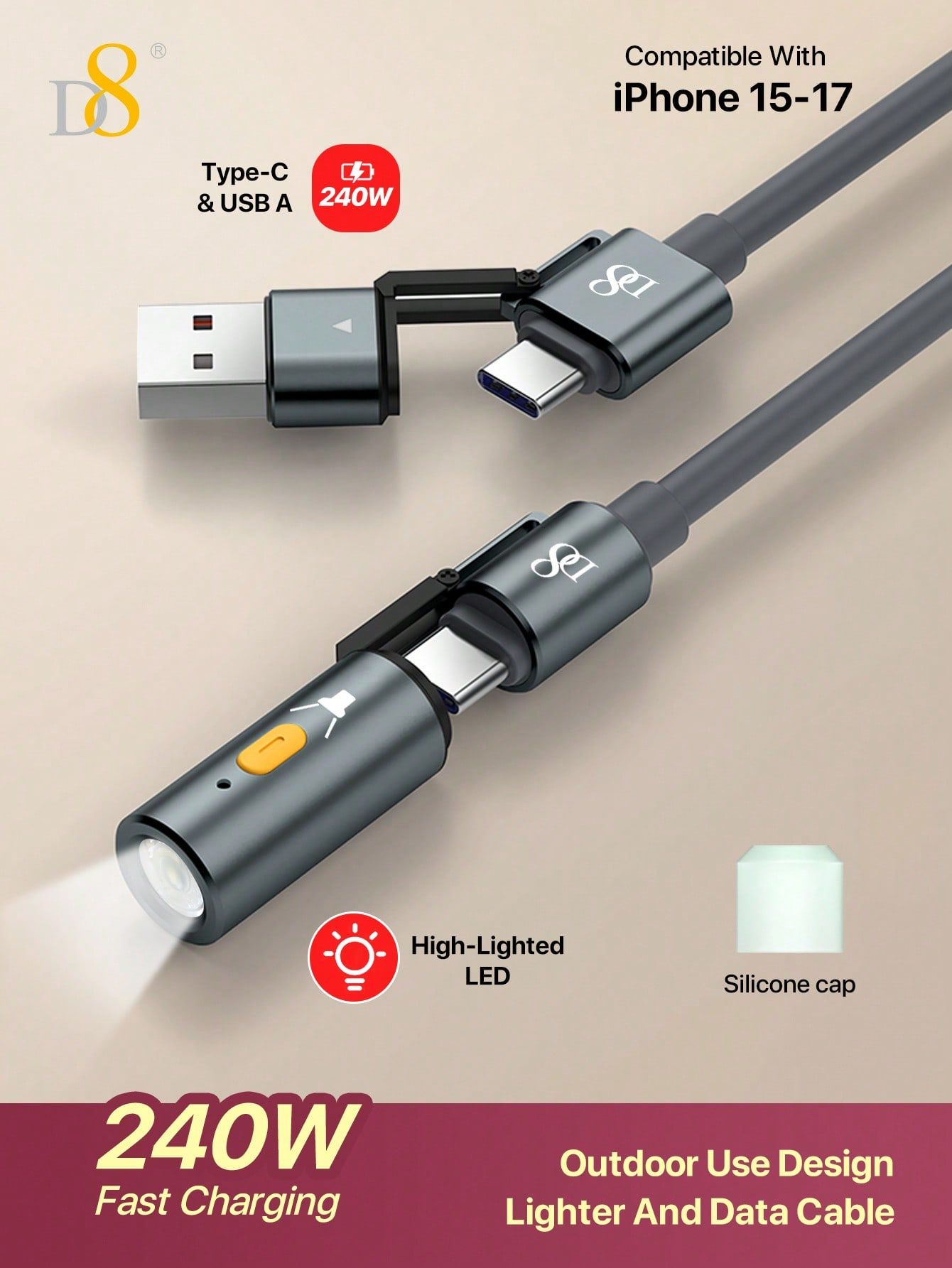 240W Fast Charging 2-in-1 USB-C & USB-A Cable with Lighter (Outdoor Design, Silicone Cap, 2S Instant Ignition, Gray)