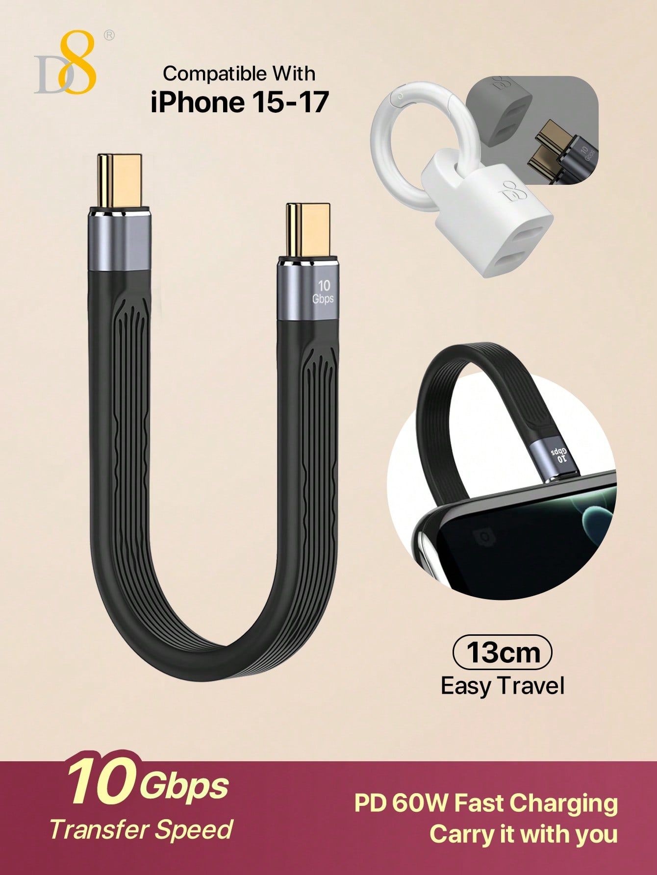 3.1A Fast Charging 5Gbps Keychain USB-C Cable (Portable Design, Compatible with iPhone 16, Black)