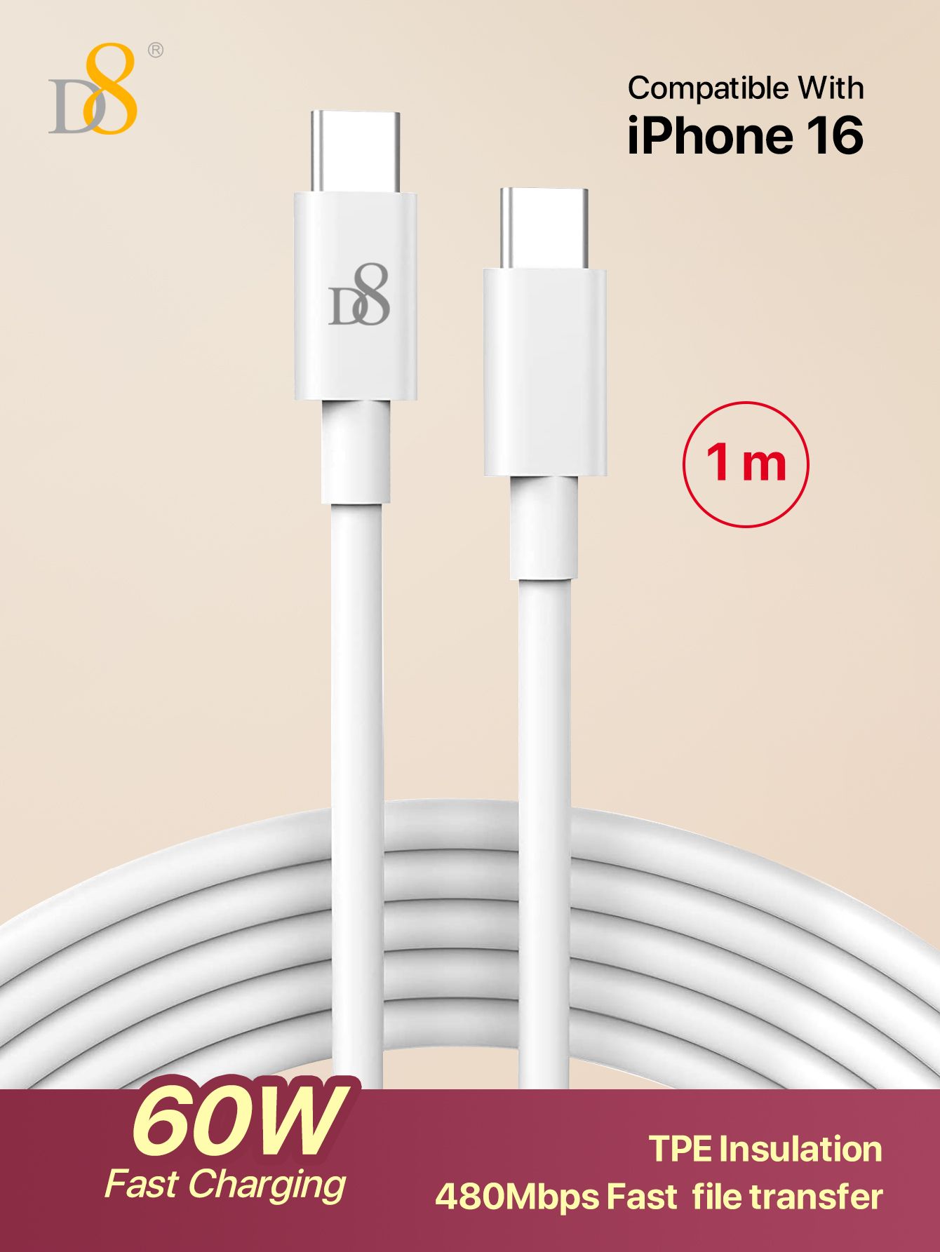 60W Fast Charging USB-C to USB-C Cable (1m Length, TPE Insulation, 480Mbps Transfer, Compatible with iPhone 16, White)