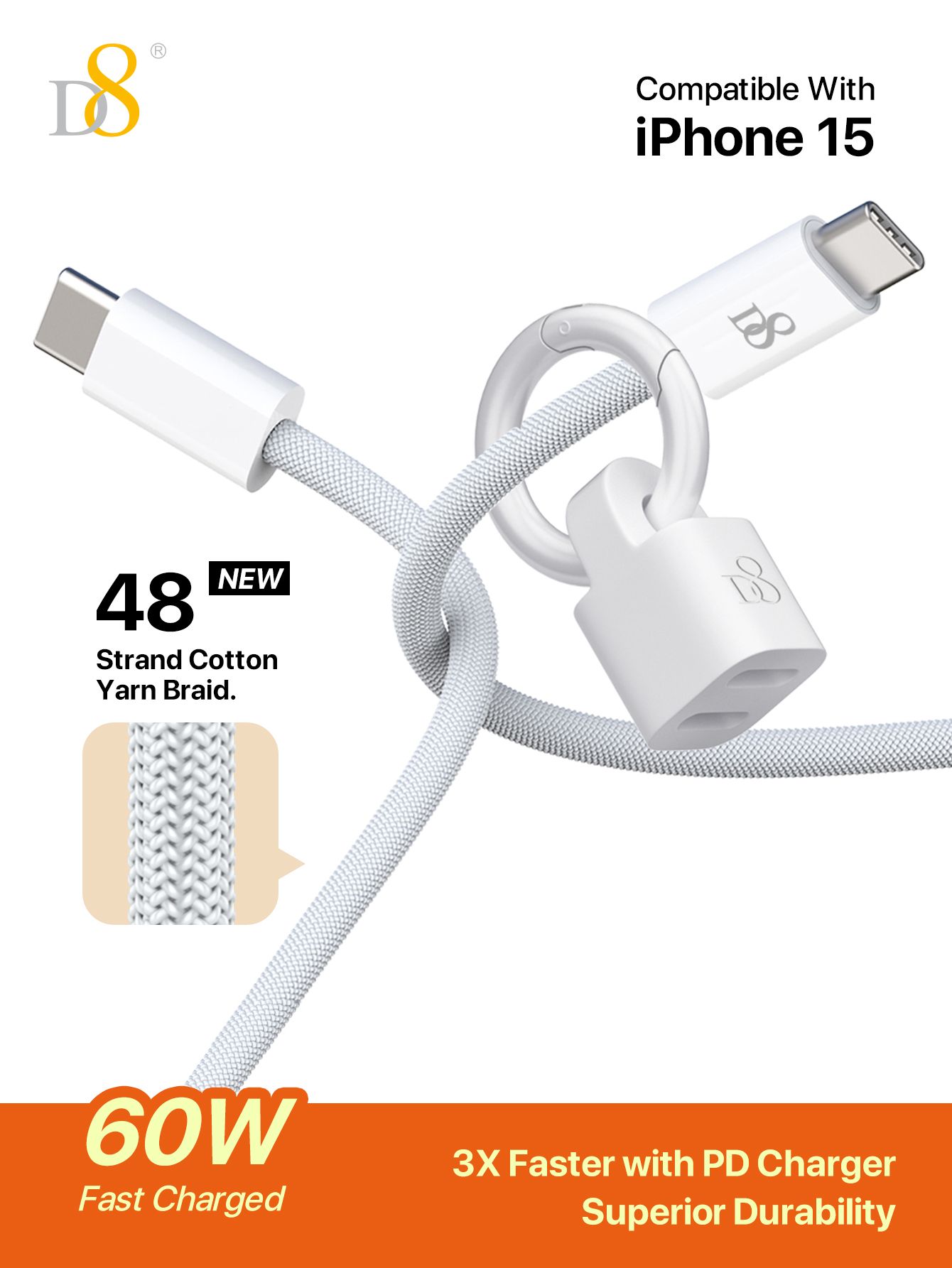 60W Fast Charging USB-C to USB-C Cable (48-Strand Cotton Yarn Braided, Portable Storage Ring, Durable, Compatible with iPhone 15, White)