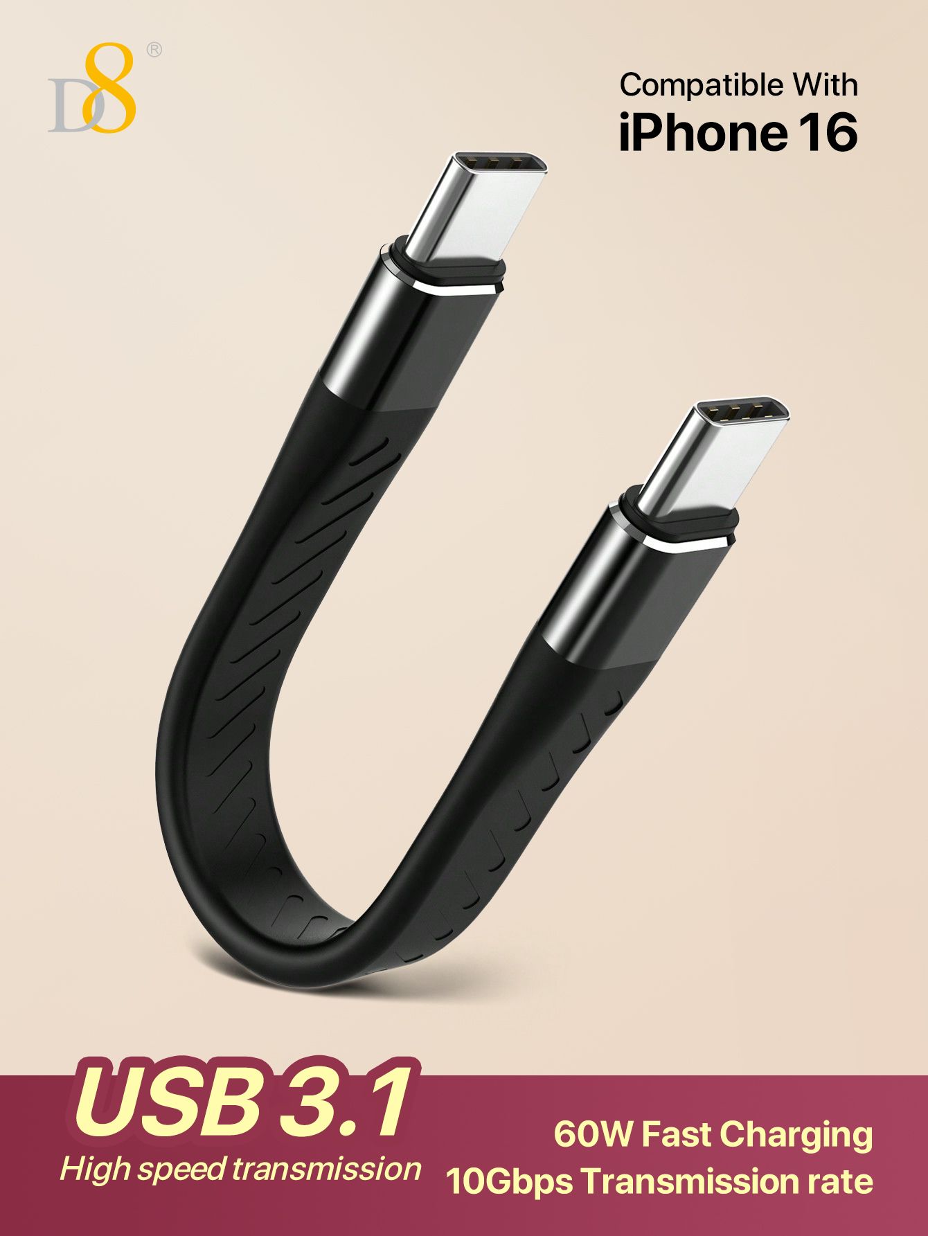 USB 3.1 10Gbps High-Speed Short USB-C to USB-C Cable (60W Fast Charging, Silicone Body, Compatible with iPhone 16, Black)