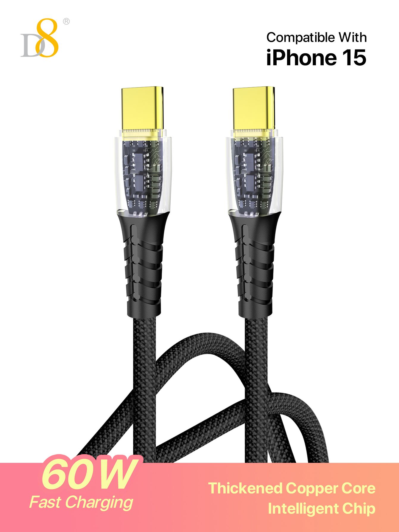 60W Fast Charging USB-C to USB-C Cable (Thickened Copper Core, Intelligent Chip, Gold-Plated Connector, Braided, Compatible with iPhone 15, Black)