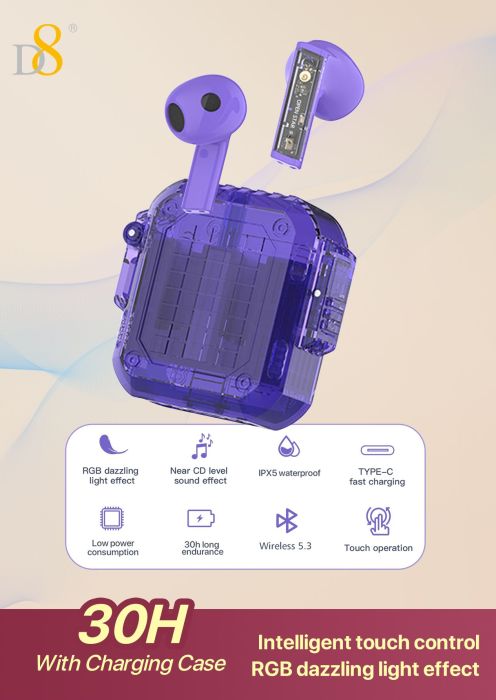 Bluetooth 5.3 TWS Earbuds (30H Total Battery with Charging Case, RGB Dazzling Light Effect, Near CD Level Sound, IPX5 Waterproof, Type-C Fast Charging, Touch Control, Transparent Purple Design)