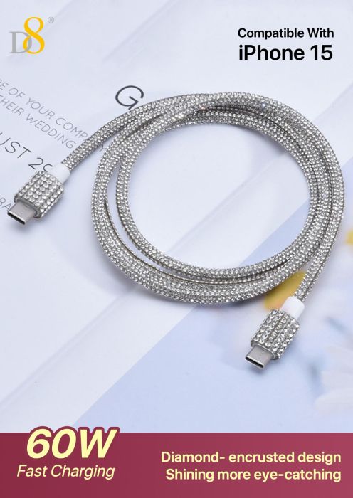 60W Fast Charging USB-C to USB-C Cable (Diamond-Encrusted Design, Shining Appearance, Compatible with iPhone 15, Silver)