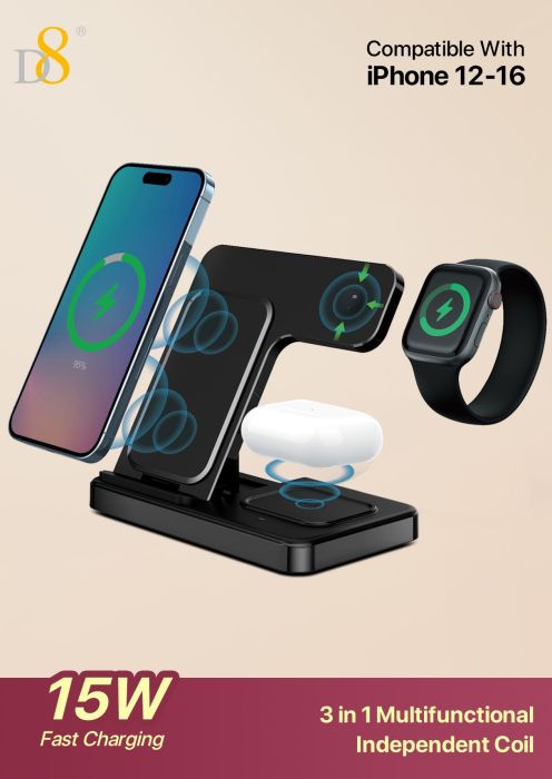 15W 3-in-1 Wireless Charger Stand (Independent Coils, Compatible with iPhone 12-16, Black)