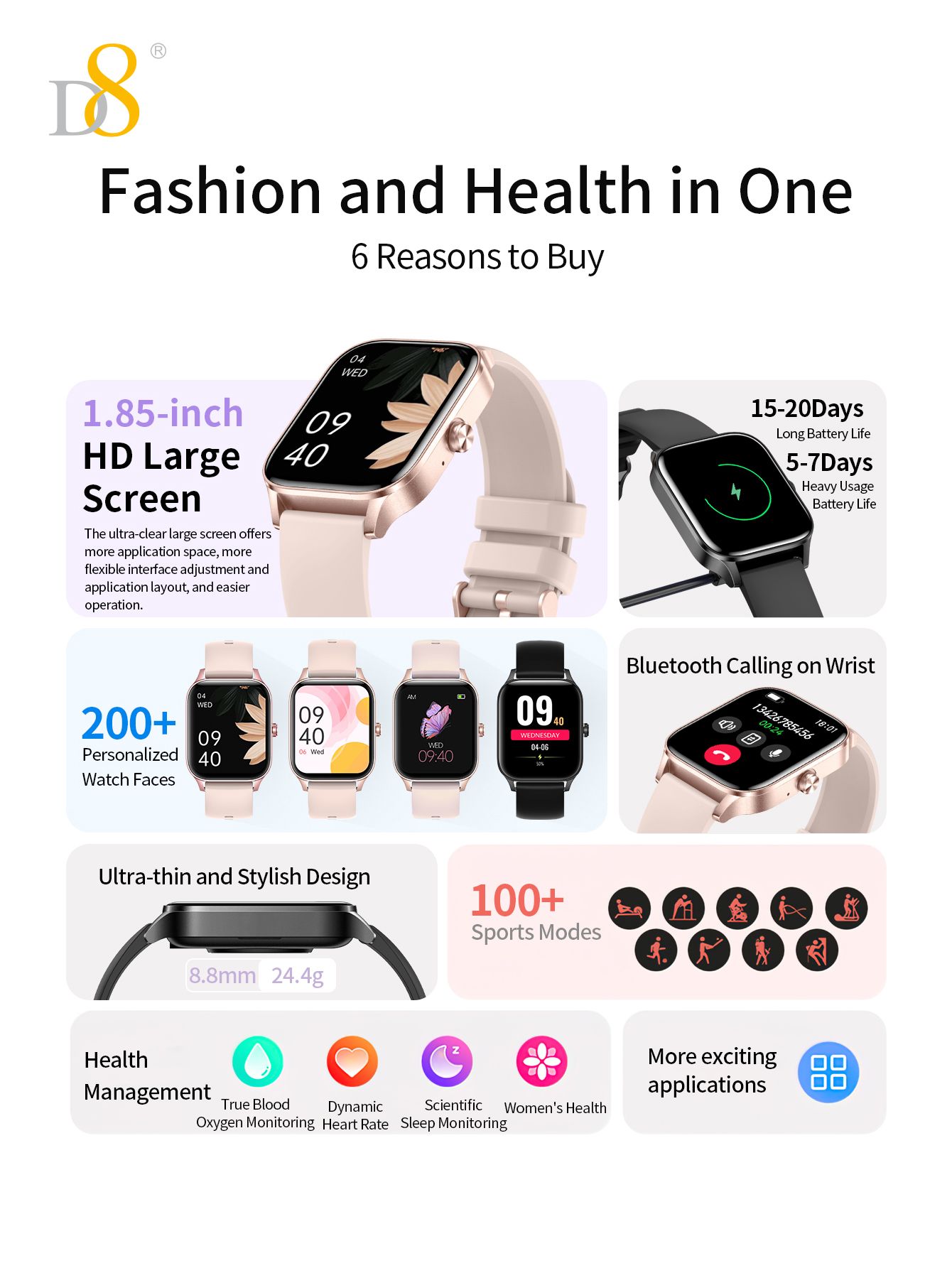 1.85" TFT Large Screen 20-day Battery Life IP68 Waterproof Smart Watch (Silicone Strap, Fashion Women's Style)