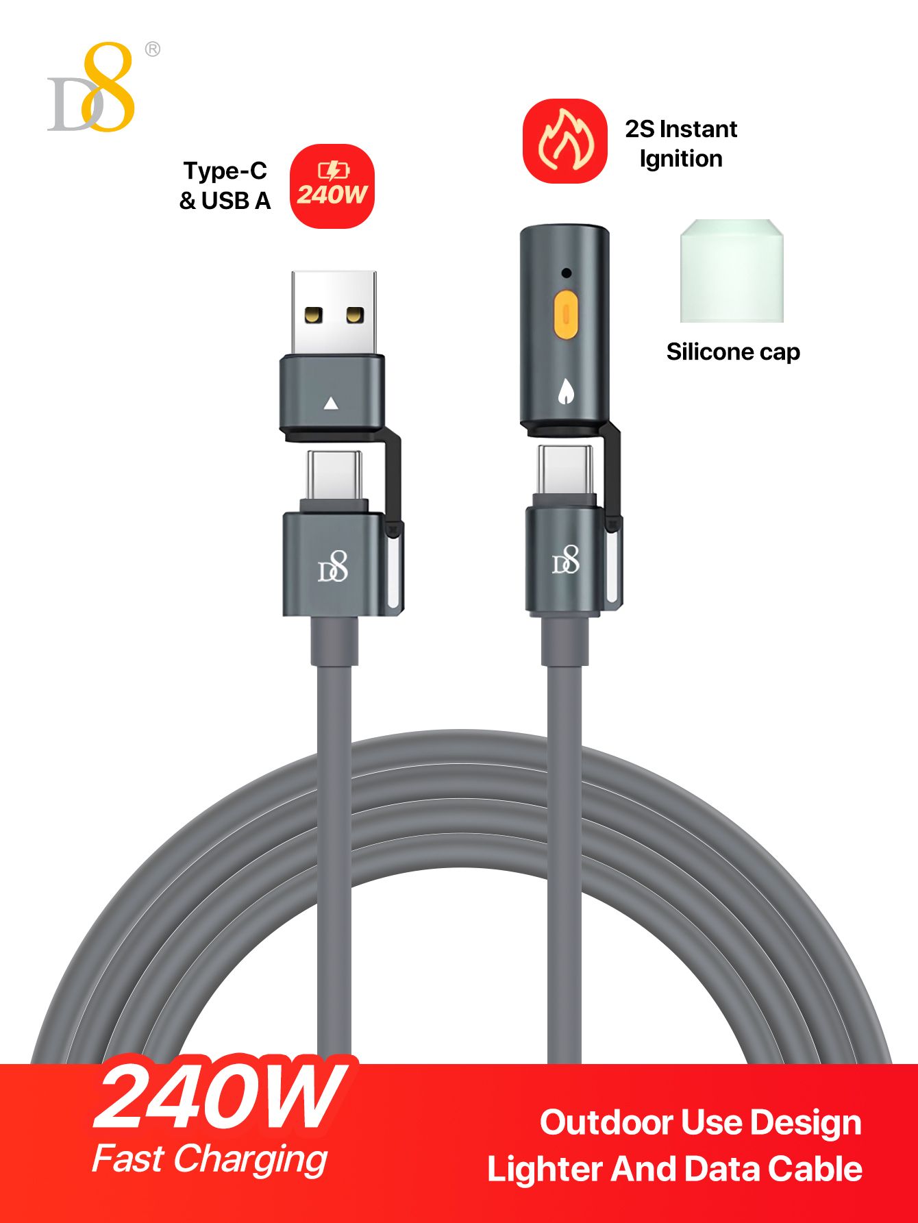 240W Fast Charging 2-in-1 USB-C & USB-A Cable with Lighter (Outdoor Design, Silicone Cap, 2S Instant Ignition, Gray)